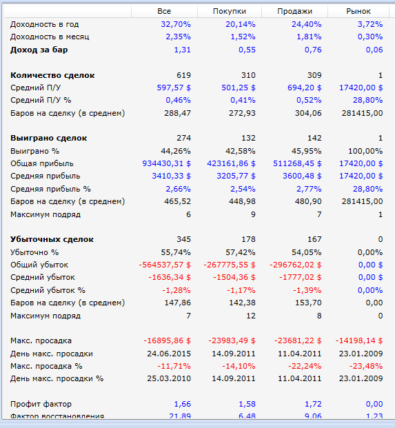 Среднесрочная трендовая стратегия на фьючерсе РТС. Робот входит на пробой из боковика в надежде поймать импульс. Также встроены некоторые фильтры. Удержание позиции - несколько часов. Период тестирования - 6 лет (2009-2014). Комиссия и проскальзование в тестах учтены и составляют 0,03% (0,06% на круг). Тесты проводились без учета плечей и без реинвестирования. Также работает на паре доллар/рубль и на акциях.