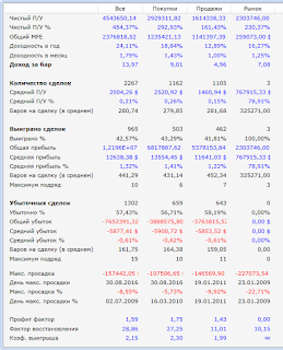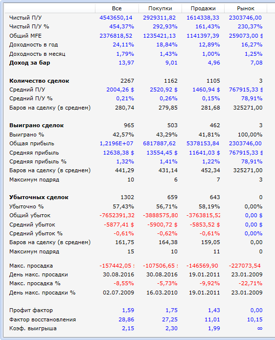 Это краткосрочная трендовая стратегия. Робот входит на пробой из боковика в надежде поймать импульс. Также встроены некоторые фильтры. Удержание позиции - несколько часов. Период тестирования - 8 лет (2009-2016). Комиссия и проскальзование в тестах учтены, на фьючерсе РТС составляют 0,02%, а на валюте 0,01%. Тесты проводились без учета плечей и без реинвестирования. Инструменты: фьючерс РТС, доллар/рубль и евро/рубль.